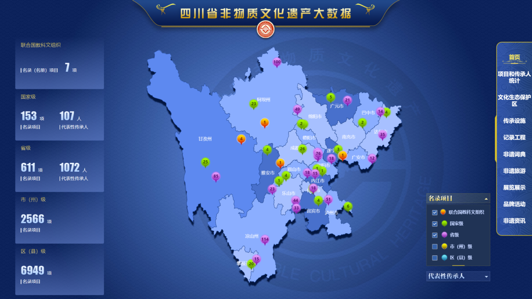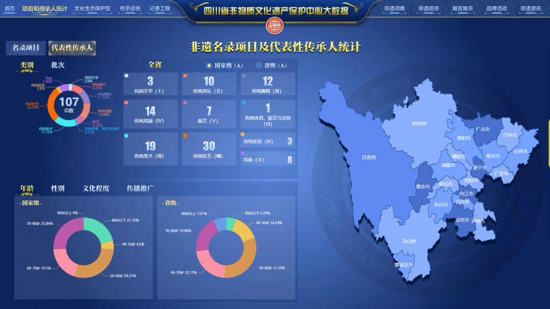 四川省非遺大數(shù)據(jù)平臺以可視化方式集中展示了四川非遺的圖文影音資源、地域分布、多維度統(tǒng)計數(shù)據(jù),包括代表性項目、代表性傳承人、傳承設施等基礎數(shù)據(jù),以及記錄工程、文化生態(tài)保護區(qū)、非遺詞典、非遺旅游、展覽展示、輿情管理等重要非遺保護工作成果。