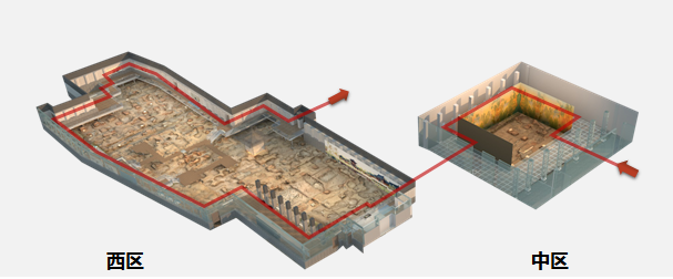 在中區(qū)遺址的設(shè)計動線上,三塊巨型幕布將遺址北、東、西三面包圍住,打造成一個沉浸式CAVE影像播放空間。